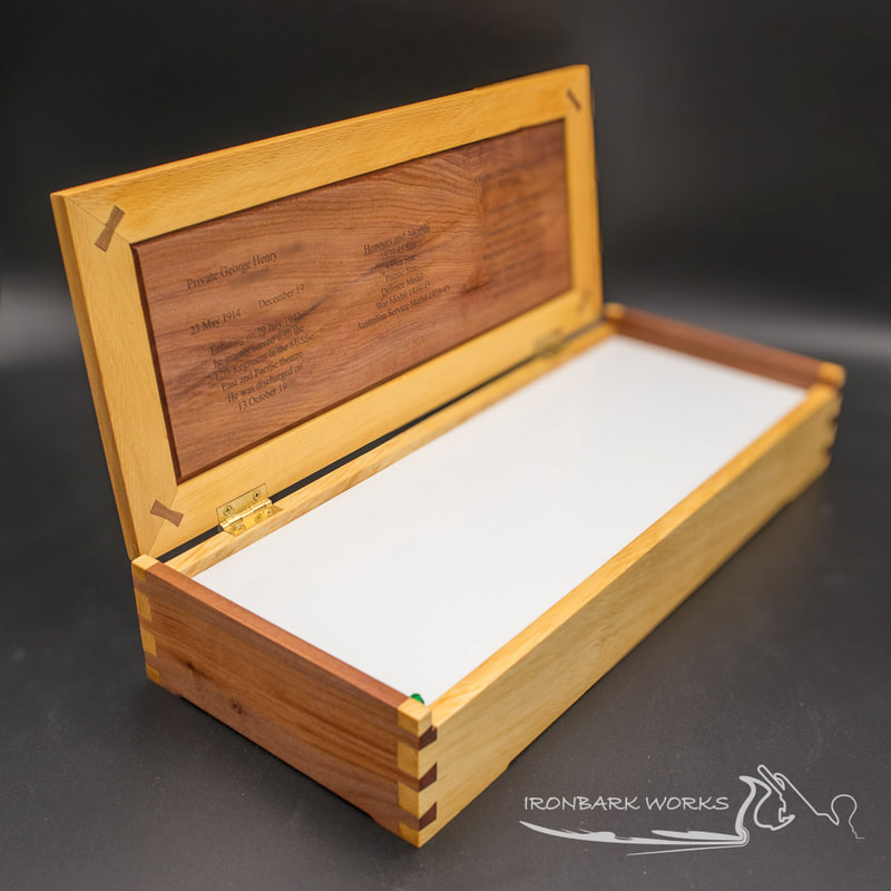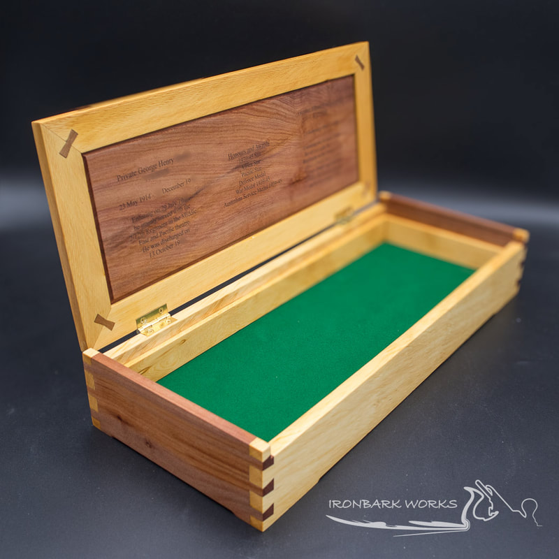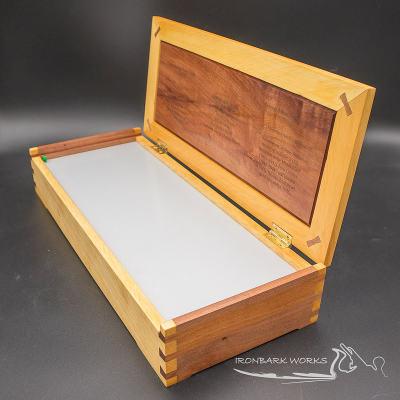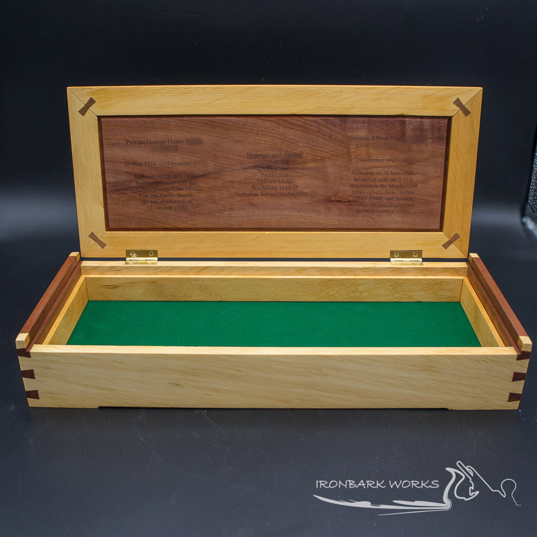 Made from Huon Pine and Myrtle with a blue velour lining this medal box was made to display four medals. Quality stop hinges from Brusso finish off this lovely box which was made for a Sailor who served during World War II. Engraved on the box lid is both the RAN badge (with the Tudor (Kings) Crown) and third edition Rising Sun badge to for time spent in both the Army and the Navy.