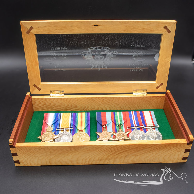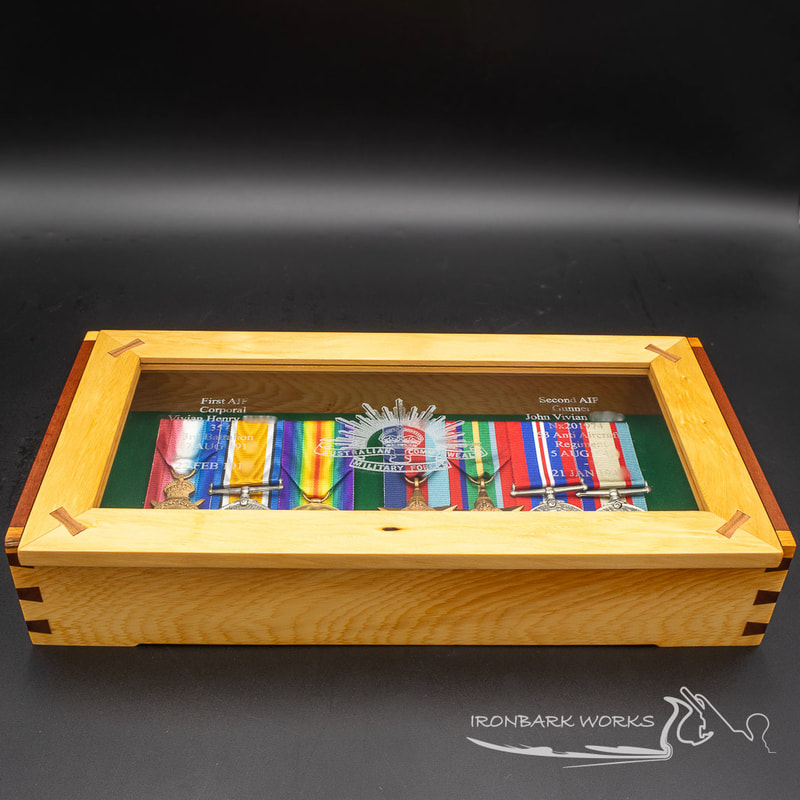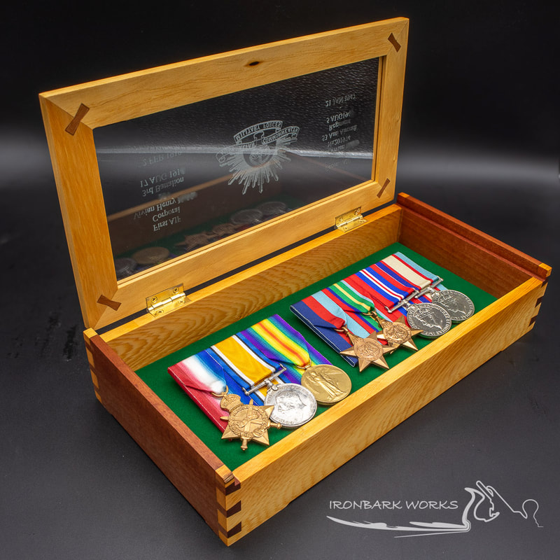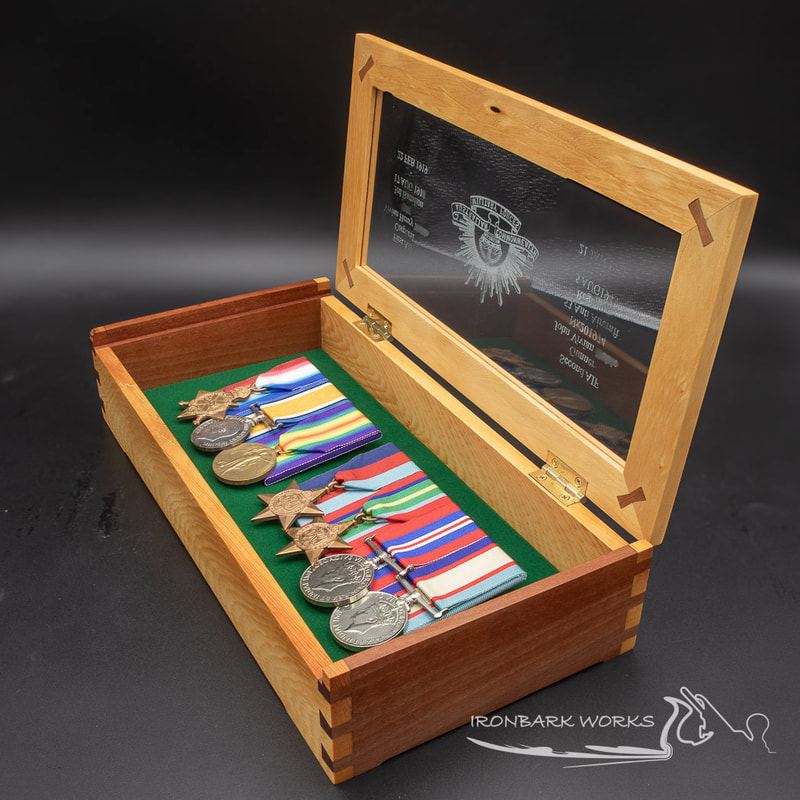 An exceptional Series I medal box, meticulously crafted for the medals of a Gunner who valiantly served in the 2nd AIF during World War Two. Made from exquisite Huon Pine and Myrtle, this heirloom piece features a glass lid, allowing a glimpse of the cherished awards within. It's a touching tribute for the Gunner's daughter, who also served (see the next box), preserving their legacy and dedication for generations to come.
