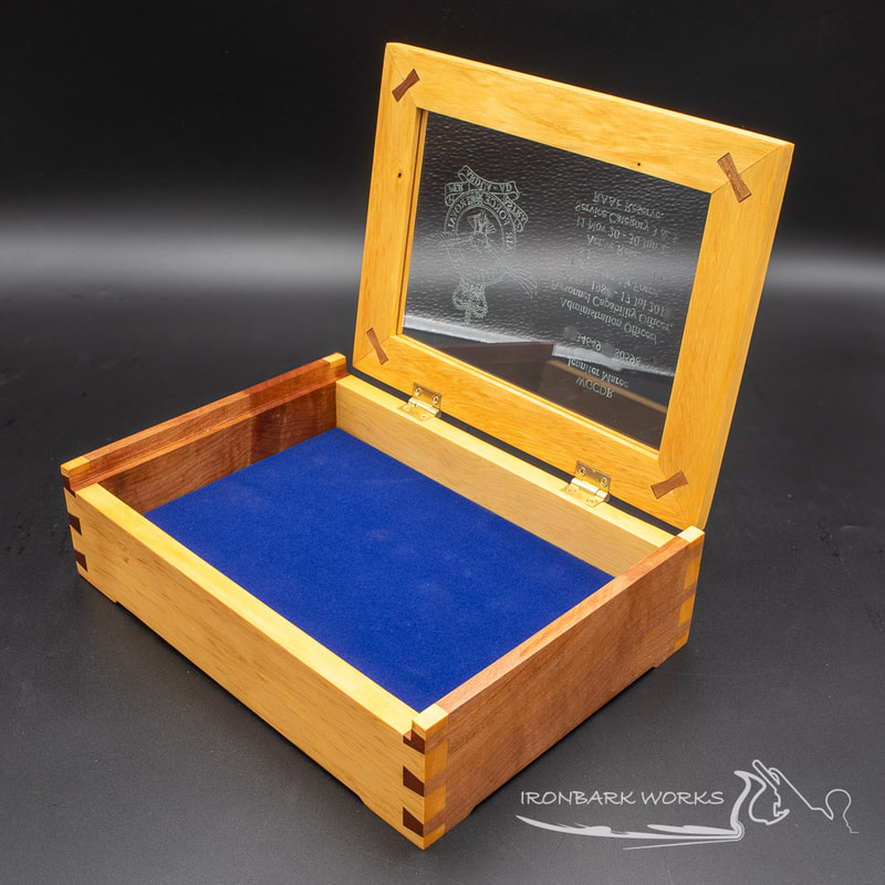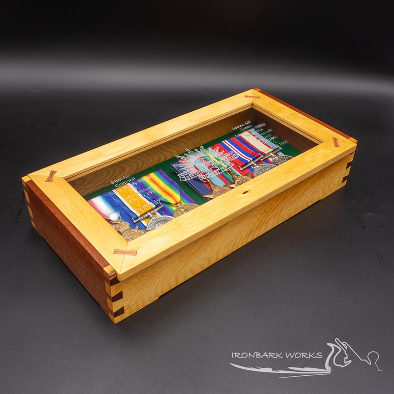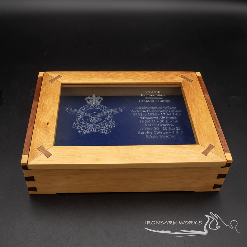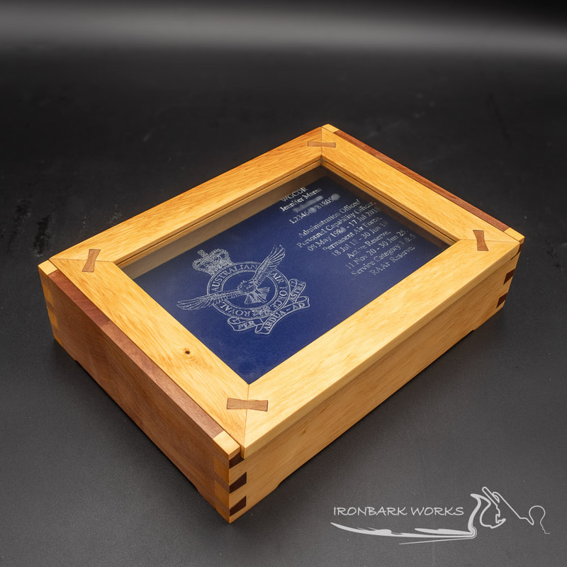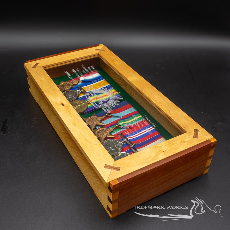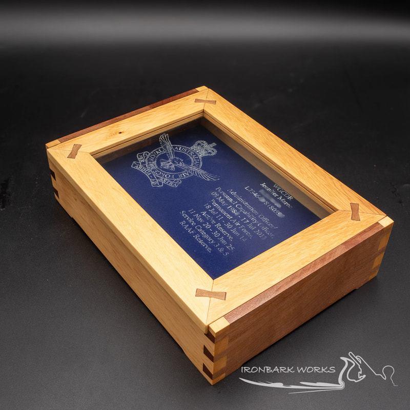 This medal box is dedicated to the remarkable daughter (refer to the previous box) who has proudly served in the RAAF for an impressive 30 years and counting. Crafted from the same exquisite combination of Huon Pine and Myrtle, it features a glass lid, allowing her to showcase her own distinguished career and achievements, continuing the legacy of service within the family.